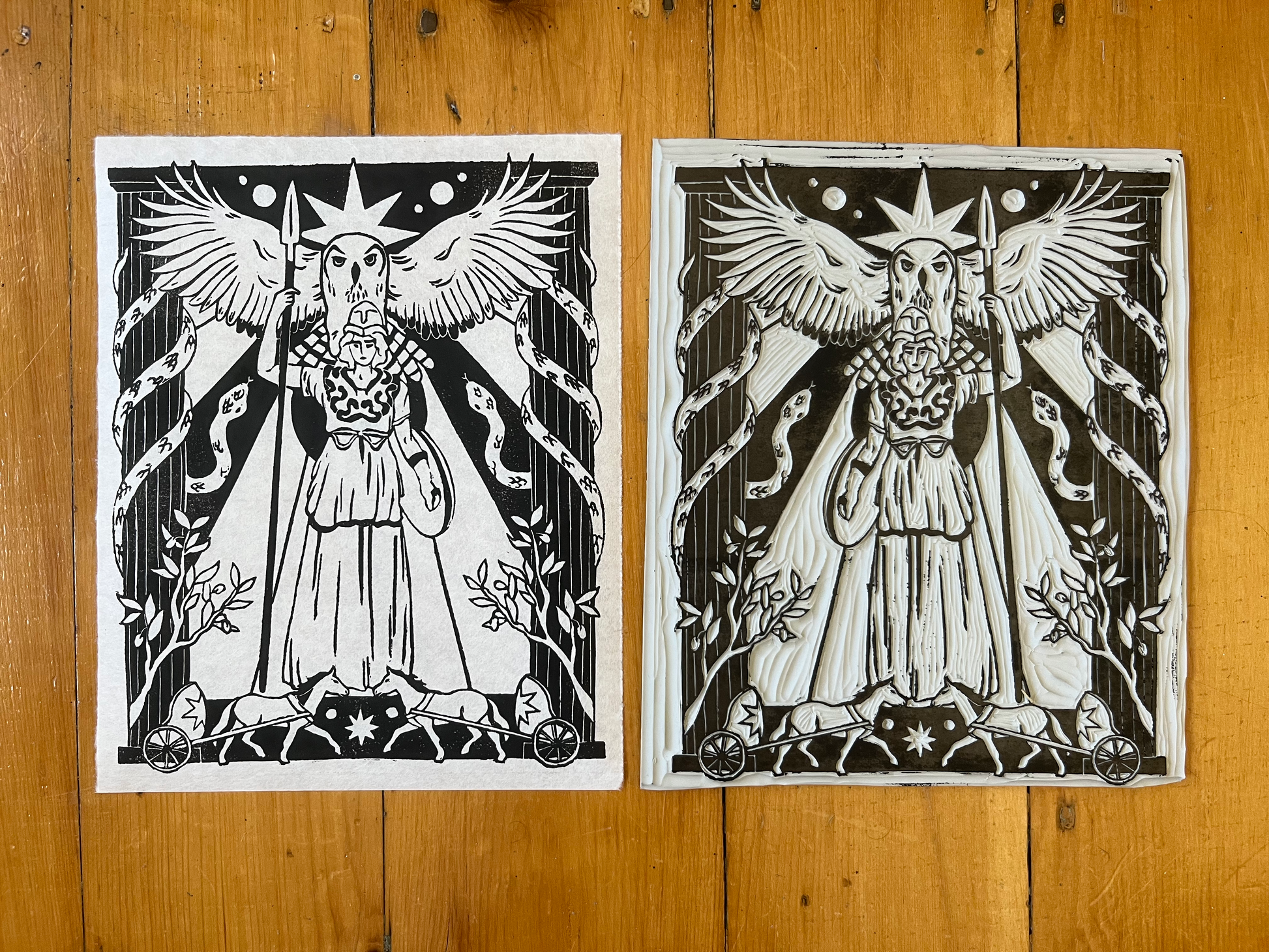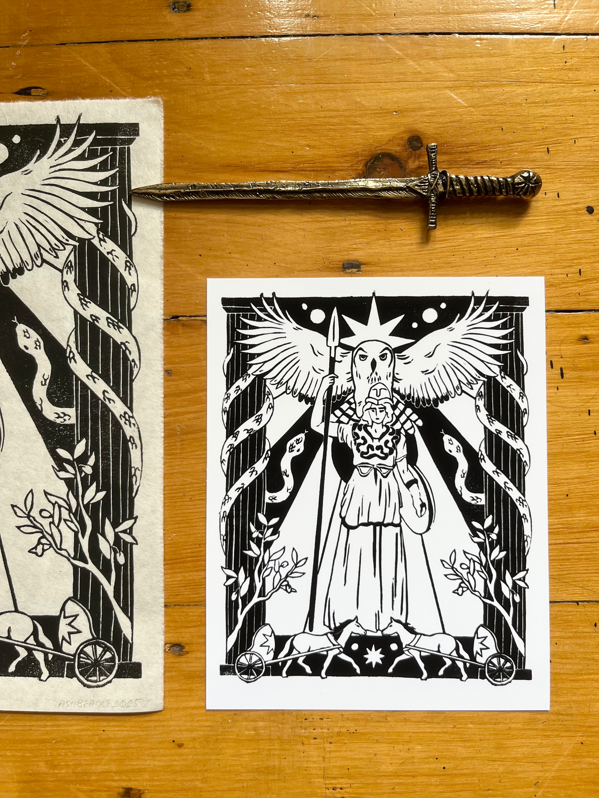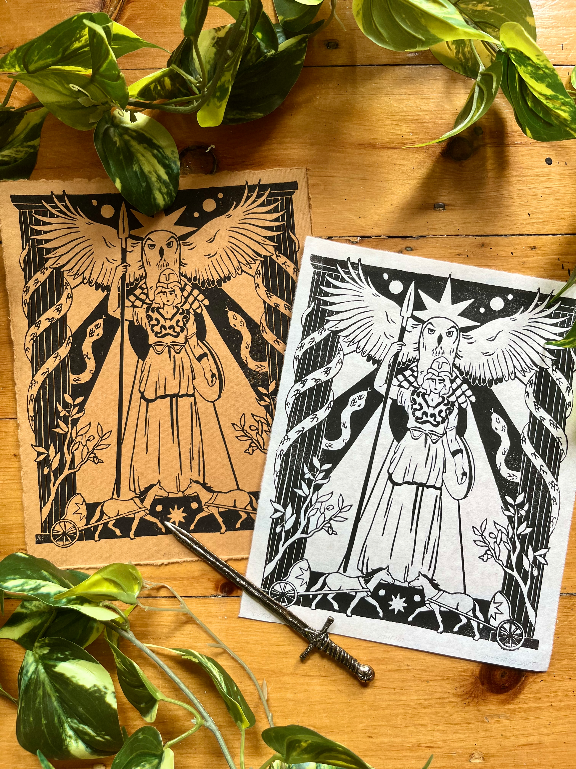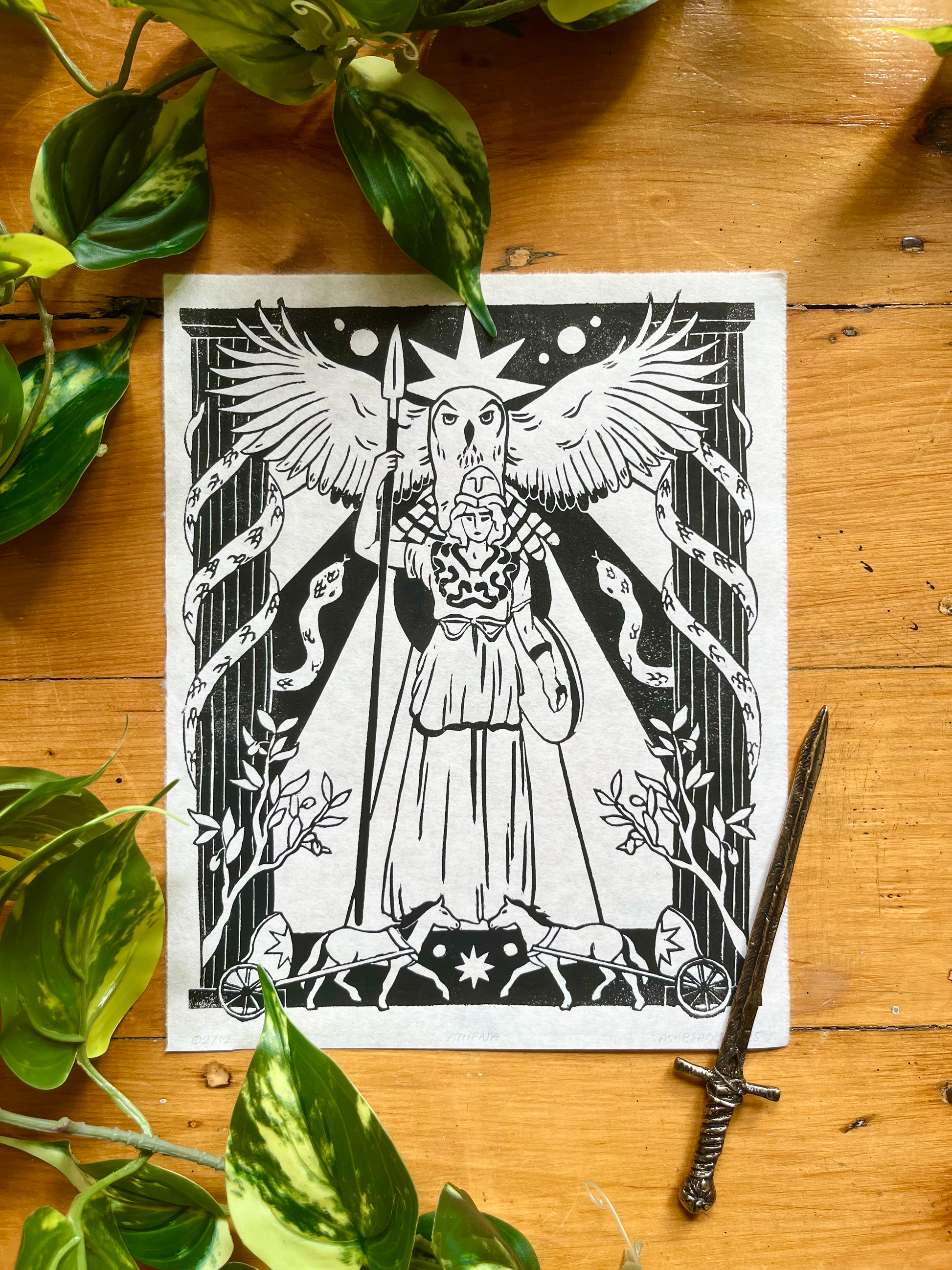 Hand carved original lino block print of Athena, the ancient Greek goddess of wisdom, warfare, and handicraft. Symbols associated with her and featured in this print are spears, snakes, owl, horses and chariots, helmets, and the olive tree.