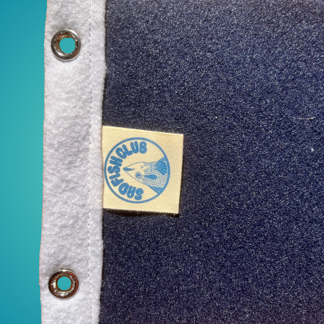 Text hand carved out of rubber lino block, printed on felt and hand sewn. Back is blank with Sad Fish Club tag.