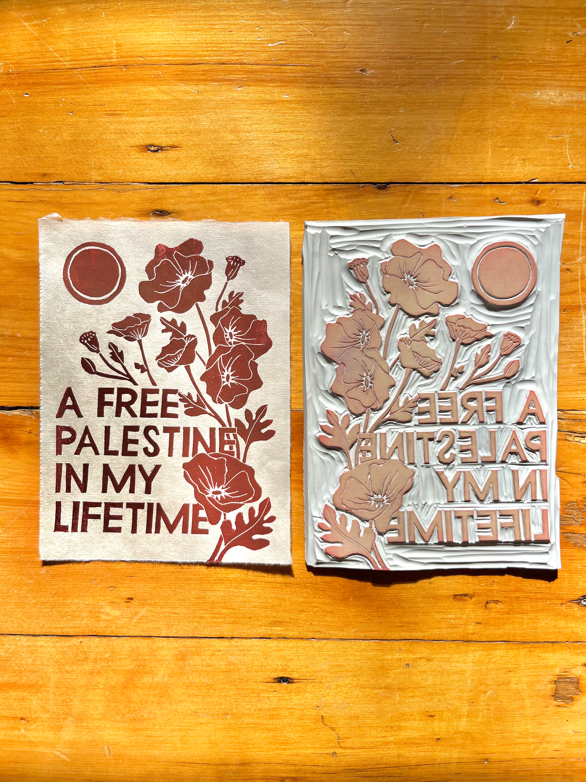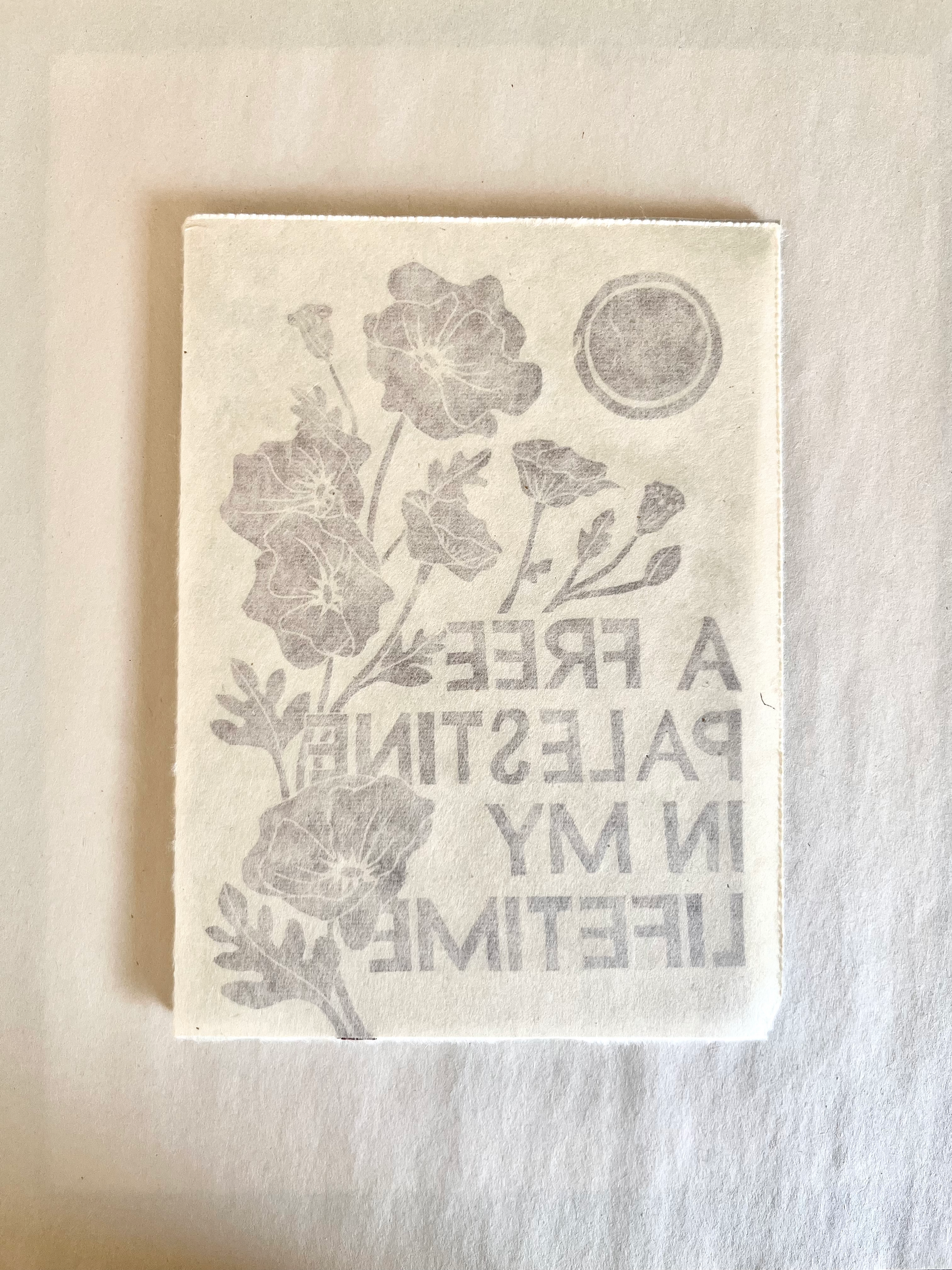 "A free Palestine in my lifetime" with poppy flowers printed on rice paper with ripped edges. Roughly 5x7 inches