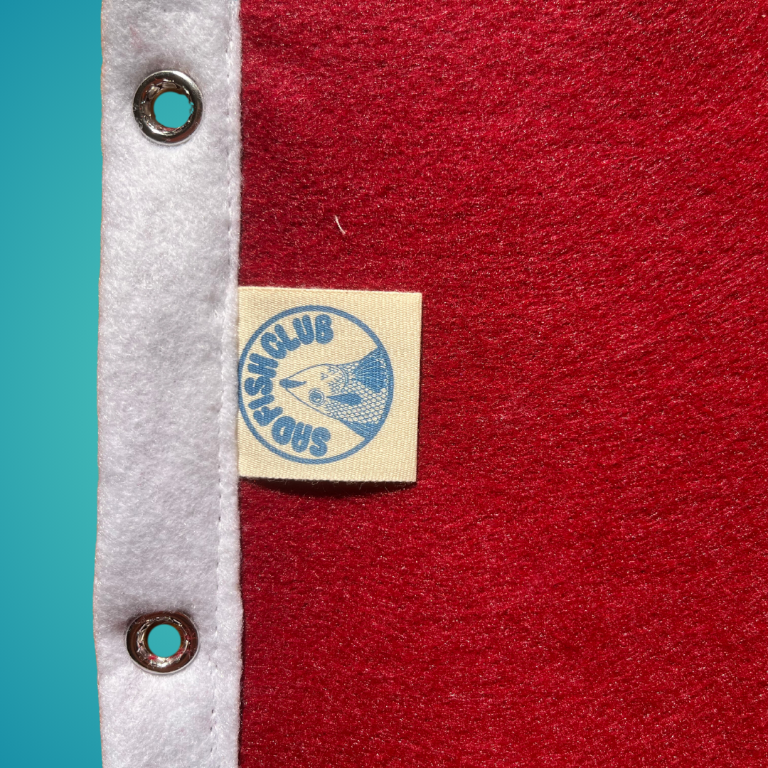 Text hand carved out of rubber lino block, printed on felt and hand sewn. Back is blank with Sad Fish Club tag.
