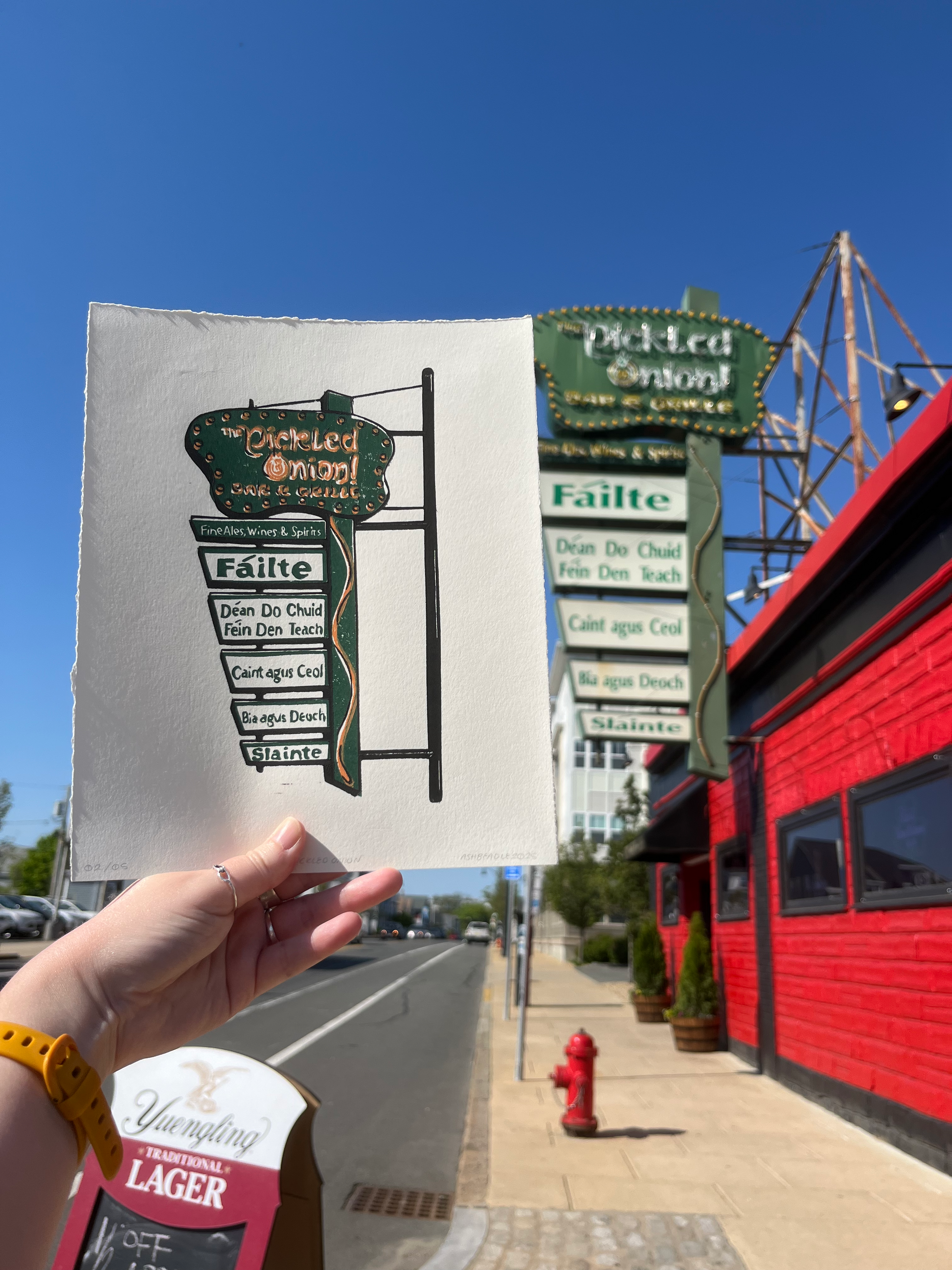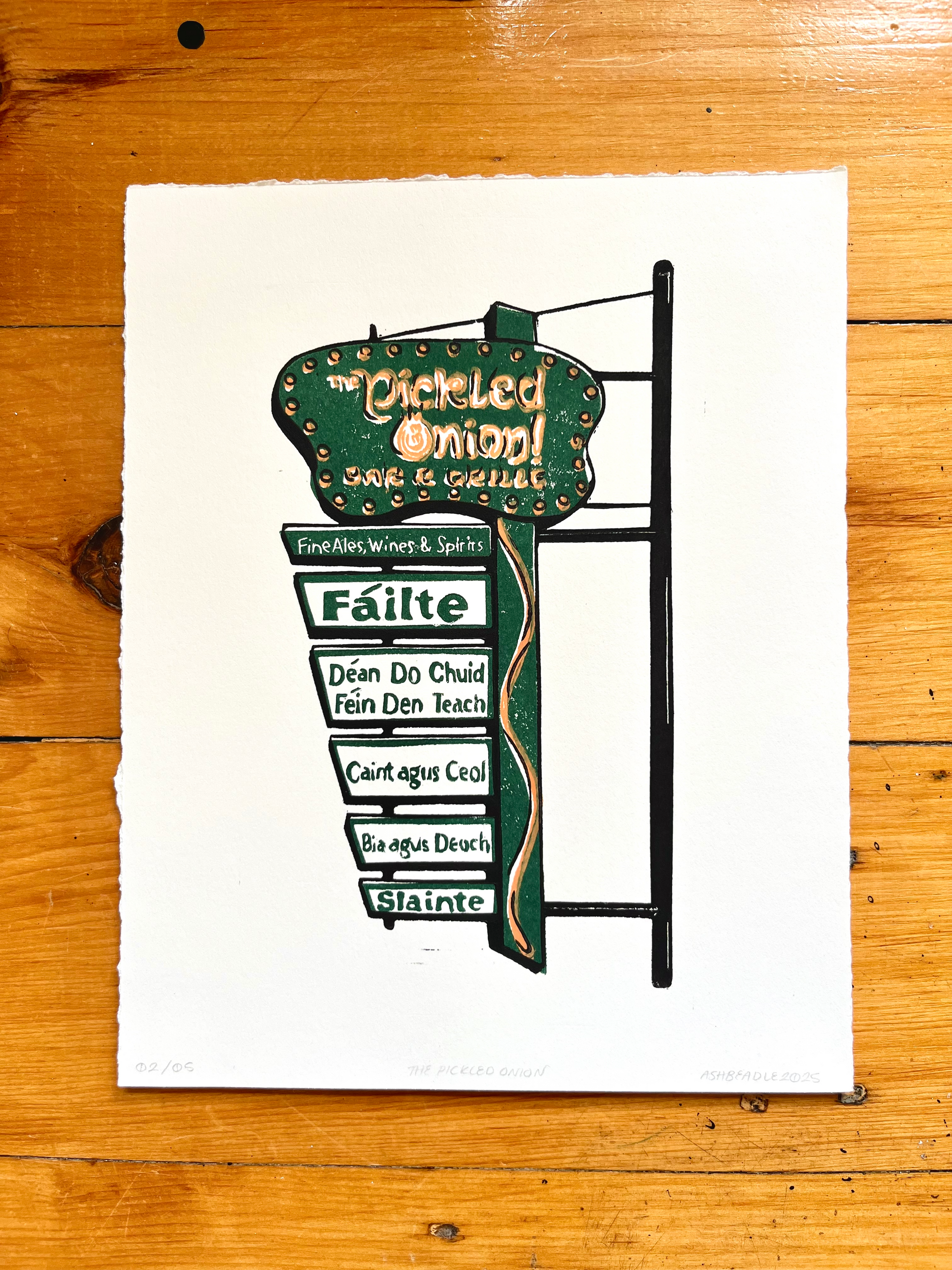 Three color lino block print of the Pickled Onion sign in Beverly, MA!